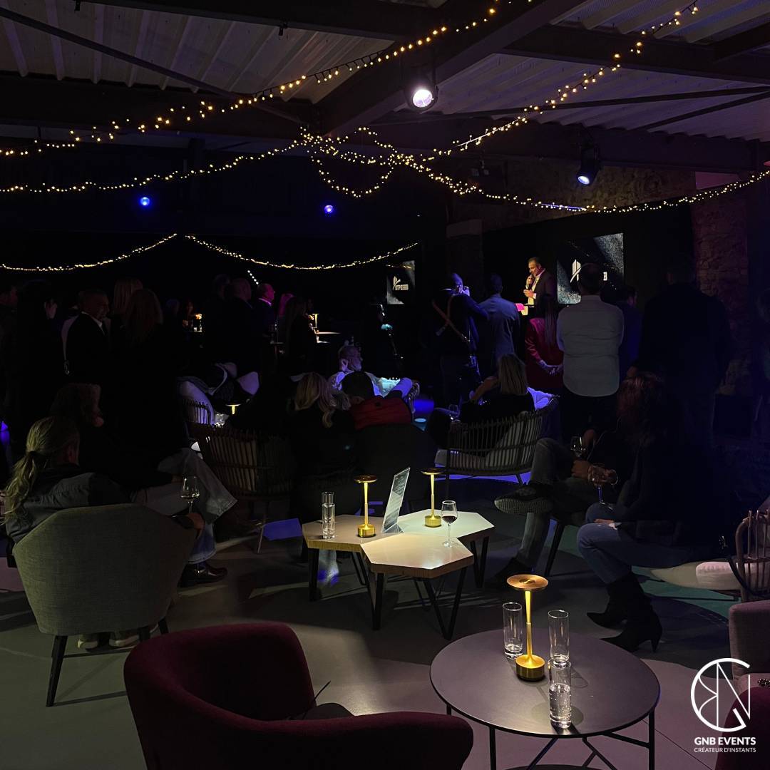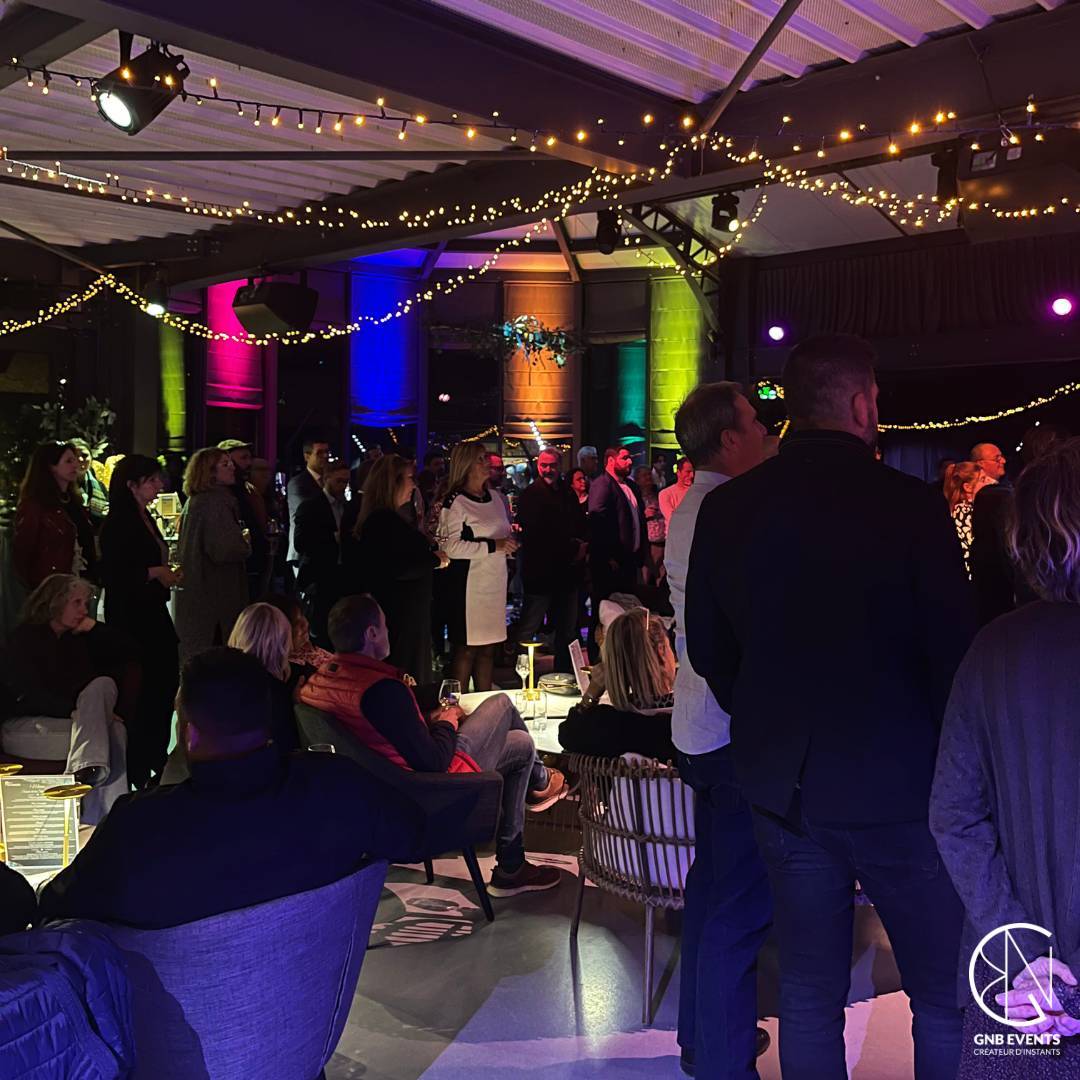 Pour enrichir l’atmosphère, un groupe de musique live distille une ambiance lounge et chaleureuse, parfaitement adaptée aux échanges informels. En parallèle, un magicien déambule parmi les invités, apportant des moments de surprise et d’émerveillement. Les projections architecturales et la mise en lumière réalisées par GNB Technique renforcent l’atmosphère unique de cette soirée, créant une ambiance à la fois festive et raffinée.