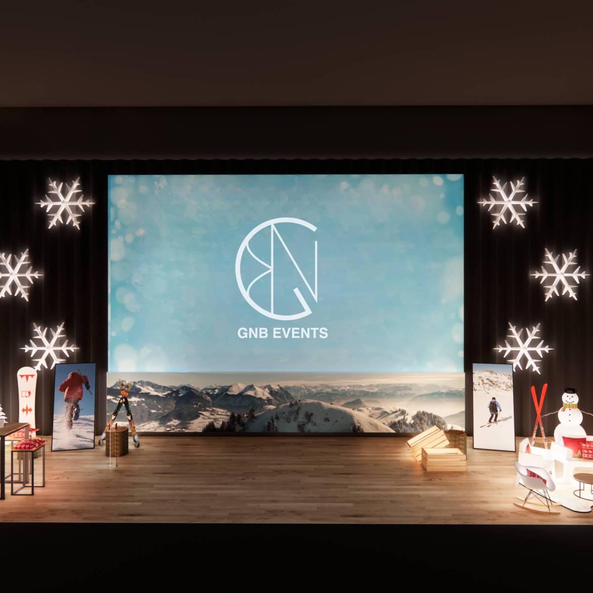 Pour les réunions, séminaires ou soirées de fin d’année, rien ne vaut une immersion totale dans l’ambiance magique de Noël. Chez GNB Events, nous vous proposons une scénographie qui enchante vos convives dès le premier regard et les transporte dans un univers montagnard et enneigé, où règnent chaleur et convivialité. Avec nos décors soigneusement sélectionnés, vos événements deviennent des moments uniques où l'esprit de Noël se ressent dans les moindres détails.